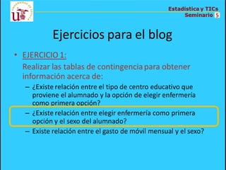 El documento describe cómo crear y analizar tablas de contingencia en estadística utilizando datos sobre estudiantes de enfermería. Explica los pasos para crear una tabla de contingencia cruzando la variable "tipo de centro previo" con la variable "enfermería como primera opción", y concluye que existe una relación entre estas variables. También crea otra tabla cruzando "sexo" con "primera opción" y concluye que no existe una relación.