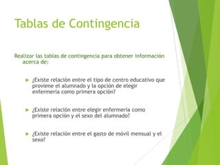 Este documento presenta tres preguntas de investigación sobre la relación entre diferentes variables y describe cómo crear tablas de contingencia en SPSS para responder a estas preguntas. Se crean tres tablas que muestran que sí existe una relación entre el tipo de centro educativo y la elección de enfermería como primera opción, y entre el gasto de móvil mensual y el sexo, pero no entre la elección de enfermería como primera opción y el sexo.
