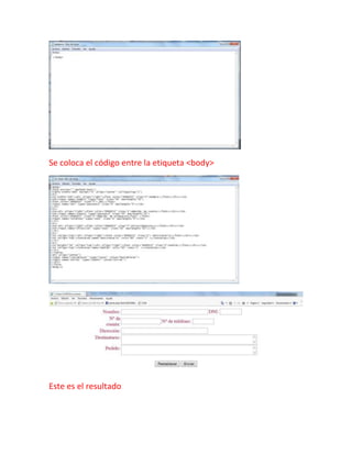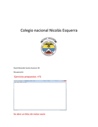 El documento presenta un resumen de 3 oraciones o menos de la siguiente información: El documento corresponde al Colegio Nacional Nicolás Esquerra. Trata sobre un estudiante llamado David Alexander Bustos Guevara y su recuperación de los ejercicios propuestos número 6 donde se abre un bloc de notas vacío y se coloca el código entre la etiqueta <body>.