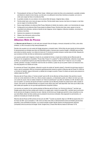 Picasa es una herramienta gratuita para visualizar, organizar y editar fotografías. Fue adquirida por Google en 2004 y permite compartir fotos en línea de forma gratuita a través de Álbumes Web de Picasa. Picasa permite editar fotos, crear álbumes y compartirlos en línea de manera privada u pública a través de una cuenta de Google.