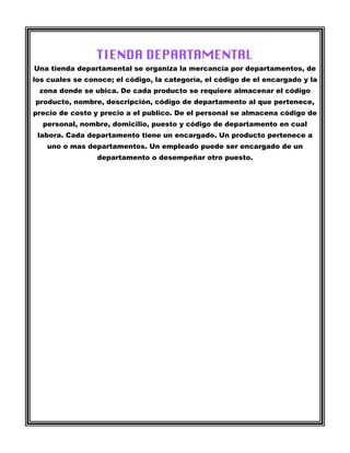 Este documento describe la organización de una tienda departamental, incluyendo los departamentos, productos, empleados y su relación. Cada departamento tiene un código, categoría, código de encargado y zona, y cada producto pertenece a un departamento específico. Los empleados están asignados a un departamento y puesto en particular.