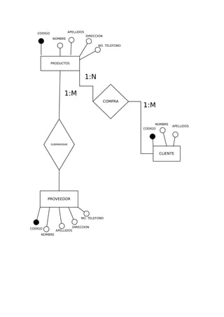 Este documento describe las relaciones entre clientes, proveedores y productos en una base de datos. Los clientes pueden comprar múltiples productos y los productos pueden ser suministrados por múltiples proveedores. La base de datos almacena información sobre clientes, proveedores y las transacciones de compra que vinculan a los clientes con los productos y los productos con los proveedores.