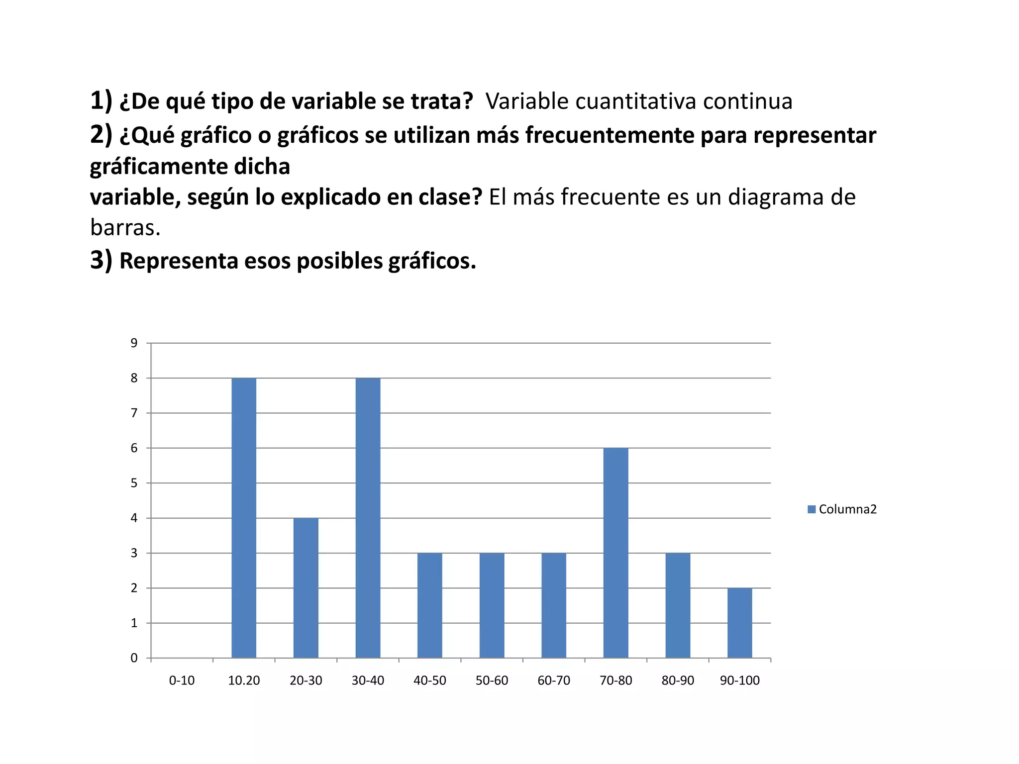El documento discute tres tipos diferentes de variables: cuantitativa continua, cuantitativa nominal y cualitativa nominal. Para variables cuantitativas continuas, el diagrama de barras es el gráfico más común. Para variables cuantitativas nominales, los gráficos de sectores son más adecuados. Para variables cualitativas nominales con muchas modalidades, los diagramas de barras son mejores, pero los gráficos de sectores también pueden usarse.