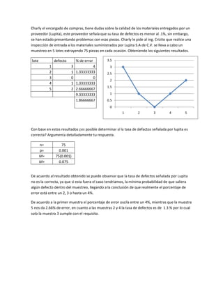 El documento presenta los resultados de una inspección de entrada realizada a materiales suministrados por un proveedor llamado Lupita S.A de C.V. Se inspeccionaron 5 lotes de 75 piezas cada uno, encontrando diferentes tasas de defectos. Con base en estos resultados, no es posible determinar si la tasa de defectos del 0.1% señalada por Lupita es correcta, ya que 4 de los 5 lotes tuvieron tasas superiores. Posteriormente, el ingeniero Crizito identificó problemas en el programa de desarrollo de proveed