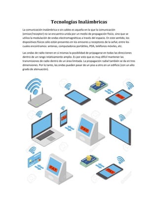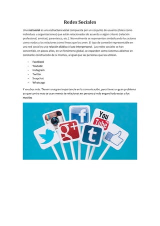 Una red social es una estructura social compuesta por usuarios relacionados según algún criterio como amistad o parentesco. Las redes sociales más populares son Facebook, YouTube, Instagram, Twitter, Snapchat y WhatsApp. Las tecnologías inalámbricas permiten la comunicación sin cables mediante ondas electromagnéticas. El hardware de redes incluye routers, modems, switches y tarjetas de red que permiten la transmisión de datos entre dispositivos. Los antivirus detectan y eliminan virus informáticos y otros malware para proteger los sistemas.