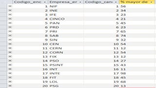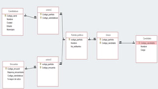 El documento describe la creación de una base de datos para almacenar información sobre las elecciones de México. La base de datos contendrá tablas para partidos políticos, candidatos, candidaturas, y encuestas electorales, y describirá las relaciones entre estas entidades, como que un candidato puede pertenecer a uno o más partidos, y una encuesta puede incluir uno o más partidos.
