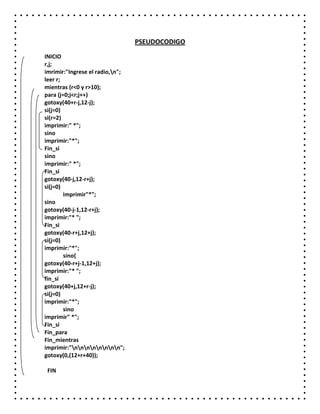 El documento presenta un pseudocódigo para crear un programa que imprima una circunferencia de radio igual al número ingresado por el usuario. El programa pedirá al usuario que ingrese un radio entre 0 y 10, y luego utilizará la función GOTOXY para imprimir asteriscos en la posición correcta y formar un círculo centrado en la pantalla con el radio provisto por el usuario.