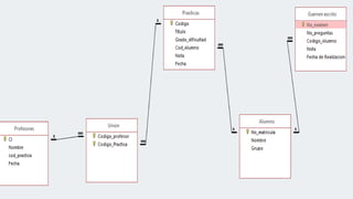 Los profesores de una escuela universitaria deciden crear una base de datos para almacenar los resultados de las pruebas de los alumnos. La base de datos contendrá información sobre los alumnos, exámenes escritos y prácticas realizadas por los alumnos a lo largo del curso académico. También almacenará datos sobre los profesores que diseñan las prácticas.
