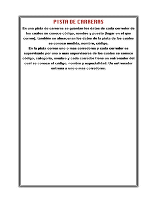 La pista de carreras almacena datos de cada corredor como su código, nombre y puesto, así como información sobre la pista como su medida y nombre. Los corredores compiten en la pista y cada uno es supervisado por uno o más entrenadores, quienes a su vez entrenan a uno o más corredores.