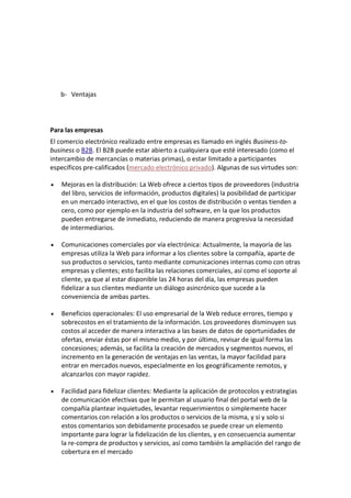 El comercio electrónico consiste en la compra y venta de productos o servicios a través de medios electrónicos como Internet. Ofrece ventajas como mejoras en la distribución, comunicaciones comerciales electrónicas y beneficios operacionales para las empresas. Sin embargo, también presenta inconvenientes como problemas de seguridad, falta de contacto personal y dificultades técnicas.