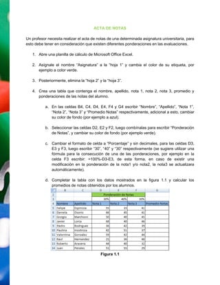 Este documento describe los pasos para crear un acta de notas en Excel para una asignatura universitaria. Incluye instrucciones para agregar el nombre de la asignatura, eliminar hojas innecesarias, crear una tabla con los nombres, notas y promedios de los estudiantes, y agregar una tabla adicional con estadísticas sobre las notas mínimas, máximas y promedio de cada evaluación.