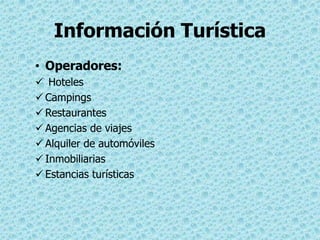 El documento proporciona una lista de alternativas para el turismo interno en Piriápolis, Uruguay, incluyendo operadores como hoteles, campings, restaurantes, agencias de viajes, alquiler de automóviles e inmobiliarias. También menciona atracciones turísticas como la Reserva del Cerro, el Puerto y la Playa, el Cerro de San Antonio, el Pan de Azúcar, las Minas de Villa Serrana, Cerro Arequita y Salto de Penitente, así como lugares históricos en Colonia como la Calle de