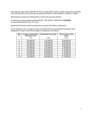 La máquina cuesta $160,000, tiene una vida útil de 10 años y se venderá por $15,000 al final. Se gastarán $5,000 en desmantelarla. El costo ajustado es $150,000. Se aplicará depreciación lineal del 10% anual durante 10 años hasta que el valor en libros sea $0.