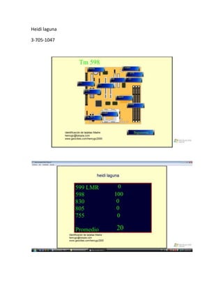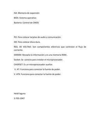 El documento describe diferentes componentes de una computadora, incluyendo la memoria de expansión ISA, el BIOS, el control CMOS de la bacteria, las ranuras PCI y IDE para tarjetas de audio, comunicación y discos duros respectivamente, los reguladores de voltaje, la memoria RAM DDRAM, el socket para el microprocesador, el chipset auxiliar, y las fuentes de poder AT y ATX.