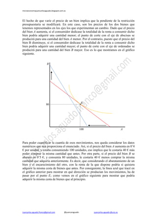 El documento analiza el comportamiento del consumidor ante cambios en los precios de dos bienes, donde un aumento en el precio del bien a y una disminución en el precio del bien b afectan su decisión de compra. Se ilustra cómo la restricción presupuestaria del consumidor varía y se establece que, ante estas condiciones, el consumidor optará por adquirir menos del bien a y más del bien b. El análisis concluye que el consumidor se ubicará en un nuevo punto de equilibrio donde maximiza su utilidad con los precios modificados.