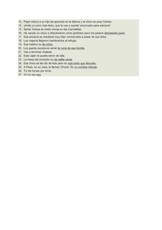 Este documento presenta 27 oraciones y pide identificar el atributo y complemento predicativo en cada una. Proporciona la solución identificando cuál es el atributo y complemento predicativo en cada oración. El atributo aporta información sobre un sujeto y el complemento predicativo aporta información sobre el verbo.