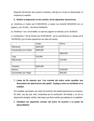 Este documento define los principales términos contables como activo, pasivo y capital. Explica las diferencias entre activo circulante y no circulante, así como entre pasivo circulante y no circulante. También describe la asimetría entre activo y pasivo diferido, y cómo el tamaño y giro de una empresa afectan el número de cuentas en sus estados financieros. Finalmente, clasifica diversas cuentas de activo y pasivo según su grado de disponibilidad y exigibilidad.