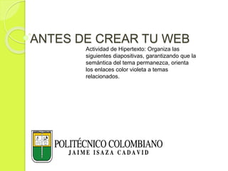 Este documento proporciona consejos y consideraciones para crear una página web exitosa. Recomienda determinar un tema atractivo para los usuarios y que se ajuste a sus necesidades, investigar el tema a profundidad antes de comenzar, y considerar factores como la popularidad del tema, la cantidad de contenido disponible y las necesidades de los visitantes potenciales. También sugiere herramientas para analizar temas populares, elegir colores atractivos, fuentes y herramientas de diseño adecuadas, y obtener un dominio y