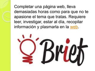 Este documento ofrece consejos para crear una página web exitosa. Recomienda que el tema de la página debe apasionarte y satisfacer necesidades de los usuarios. Además, sugiere considerar factores como la popularidad del tema, la cantidad de conocimiento requerido, y el potencial de tráfico. Finalmente, enfatiza la importancia de seguir las leyes y crear una navegación intuitiva para los visitantes.