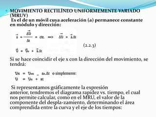 Este documento presenta un ejercicio de Matlab sobre el movimiento rectilíneo uniformemente variado (MRUV). El ejercicio implica medir el tiempo que tarda un móvil en recorrer diferentes distancias y graficar los datos para analizar la relación cuadrática entre el tiempo y la distancia. Se realiza un ajuste polinómico de segundo grado a los puntos de la gráfica y se grafica la función resultante para modelar el movimiento MRUV.