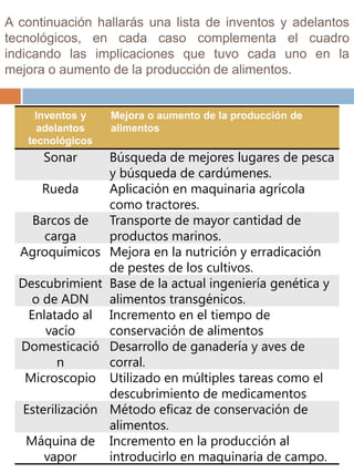 Los inventos y adelantos tecnológicos como la maquinaria agrícola, los fertilizantes y los pesticidas químicos tuvieron grandes implicaciones en la mejora y aumento de la producción de alimentos al hacer que la agricultura sea más eficiente y productiva.