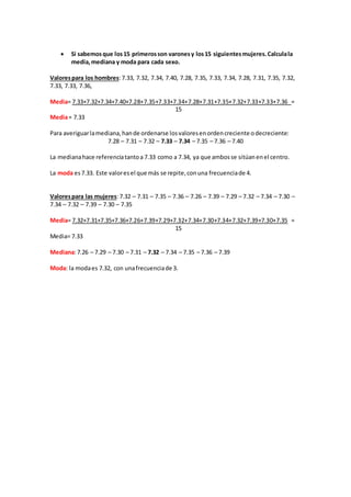 Este documento presenta los resultados de 30 mediciones del pH sanguíneo. Incluye una tabla de frecuencia que muestra la distribución de los valores de pH. La media del total de muestras es 7.33, la mediana es también 7.33 y la moda es 7.32. Al dividir las muestras en hombres y mujeres, la media para ambos es 7.33, pero sus medianas y modas varían ligeramente.