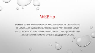 La Web 3.0 se refiere a una evolución futura de Internet donde la red semántica permitirá que las máquinas entiendan el significado del contenido en la web para procesar y compartir información de manera más inteligente e intuitiva para los usuarios. Algunas características clave incluyen el uso del lenguaje natural, la inteligencia artificial, la web semántica y la capacidad de las páginas web de conectarse entre sí según los intereses del usuario.