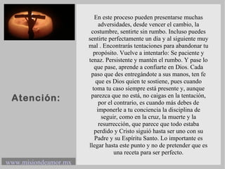 Este documento detalla un ejercicio espiritual destinado a ayudar a las personas a superar adicciones y errores, enfatizando la importancia de la perseverancia, la fe en Dios y la meditación. Se ofrecen diversas técnicas de reflexión y oración, incluyendo la invocación a Cristo y al Espíritu Santo, para fomentar la sanación y corrección de comportamientos dañinos. El enfoque es en la disciplina y la conexión con lo divino para encontrar alivio y fortaleza en momentos de debilidad.