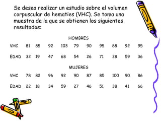 El documento describe 5 ejercicios estadísticos para analizar datos sobre el volumen corpuscular de hematíes (VHC) y edad de hombres y mujeres usando el programa SPSS. Los ejercicios incluyen calcular medidas como la media, moda y desviación estándar del VHC y edad, obtener frecuencias de sexo, edad y VHC, crear gráficos de distribución de las variables, y crear una tabla que relacione edad y sexo.