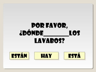 Este documento contiene varias preguntas sobre la ubicación de personas y objetos utilizando las palabras "está/están/hay". Las respuestas a las preguntas indican dónde se encuentran las personas, objetos o actividades mencionadas utilizando consistentemente las palabras "está/están/hay".