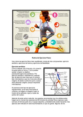 El documento describe los beneficios del ejercicio físico para la salud física y mental. Explica que el ejercicio regular mejora la forma física, regula la presión arterial, mejora la densidad ósea y la resistencia a la insulina, ayuda a mantener el peso y aumenta la fuerza muscular. También mejora la autoestima, reduce el estrés y la depresión, y mejora el bienestar general. Además, detalla los tres componentes clave de una rutina de ejercicios equilibrada: ejercicio aeróbico, ejerc