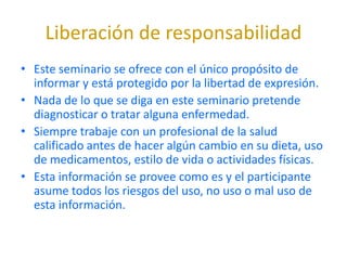 Este seminario trata sobre el ejercicio funcional. Se explica que el ejercicio funcional se enfoca en mejorar las habilidades biomotoras relevantes para cada individuo mediante el entrenamiento de los seis patrones primarios de movimiento de una manera progresiva, comenzando con aislamiento muscular y terminando con movimientos integrales y funcionales. El seminario también advierte que se ofrece solo con fines informativos y que los participantes deben consultar a un profesional de la salud antes de realizar cambios.