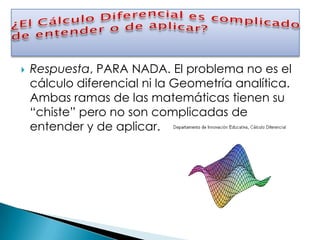 El documento discute el cálculo diferencial y la geometría analítica, afirmando que no son complicados de entender o aplicar siempre que se tengan las matemáticas básicas. También explica que el cálculo diferencial es un método universal que se puede usar en diversas áreas para encontrar máximos y mínimos de funciones. Incluye un enlace a un video con más información sobre el tema.