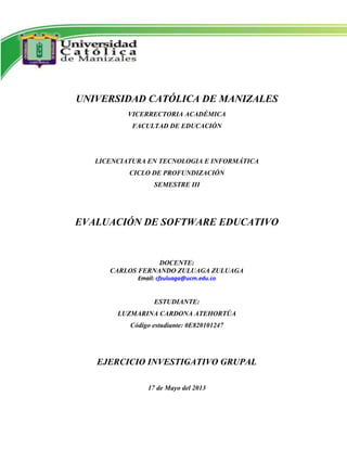 Este documento presenta el diseño de un instrumento para evaluar software educativo. El instrumento contiene secciones para evaluar aspectos pedagógicos, técnicos y multimediales. Se aplica el instrumento para evaluar un software educativo llamado "Let's Go" diseñado para enseñar inglés a niños en edad preescolar. La evaluación encuentra que el software es adecuado desde el punto de vista pedagógico pero requiere mejoras en los aspectos técnicos y de multimedia. Adicionalmente, se propone un proceso general para el