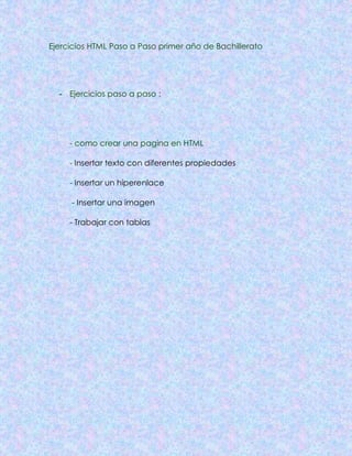 Este documento presenta una guía de ejercicios paso a paso para aprender HTML en el primer año de bachillerato. Incluye instrucciones para crear una página básica en HTML, insertar texto con diferentes propiedades, agregar hipervínculos e imágenes, y trabajar con tablas. El documento proporciona ejemplos de código HTML y pasos detallados para completar cada ejercicio propuesto.