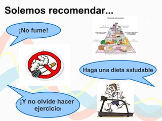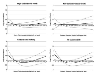 Este documento discute los beneficios y riesgos del ejercicio para la salud cardiovascular. Resalta que el ejercicio de intensidad moderada como caminar o andar en bicicleta reduce el riesgo de enfermedades, pero que el ejercicio intenso de más de 5 horas a la semana desde los 30 años puede aumentar el riesgo de fibrilación auricular. También encuentra que tanto la falta de actividad como el ejercicio intenso diario aumentan el riesgo de eventos cardiovasculares en personas con angina estable. Concluye recomendando al menos