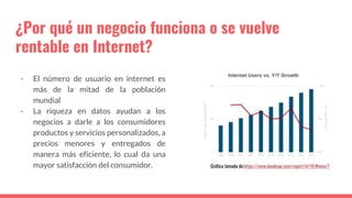 Este documento discute por qué los negocios tienen éxito en Internet. Explica que más de la mitad de la población mundial usa Internet y que los datos ayudan a las empresas a ofrecer productos y servicios personalizados a precios bajos de manera eficiente. Luego analiza casos exitosos como Amazon, Zara y Netflix, destacando cómo usan datos de clientes y personalización para brindar una excelente experiencia de usuario.
