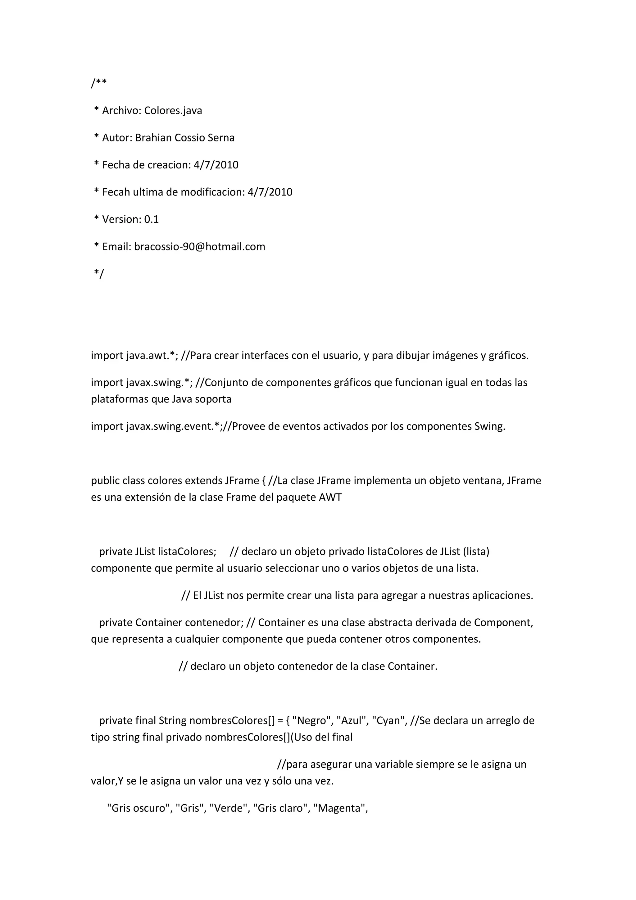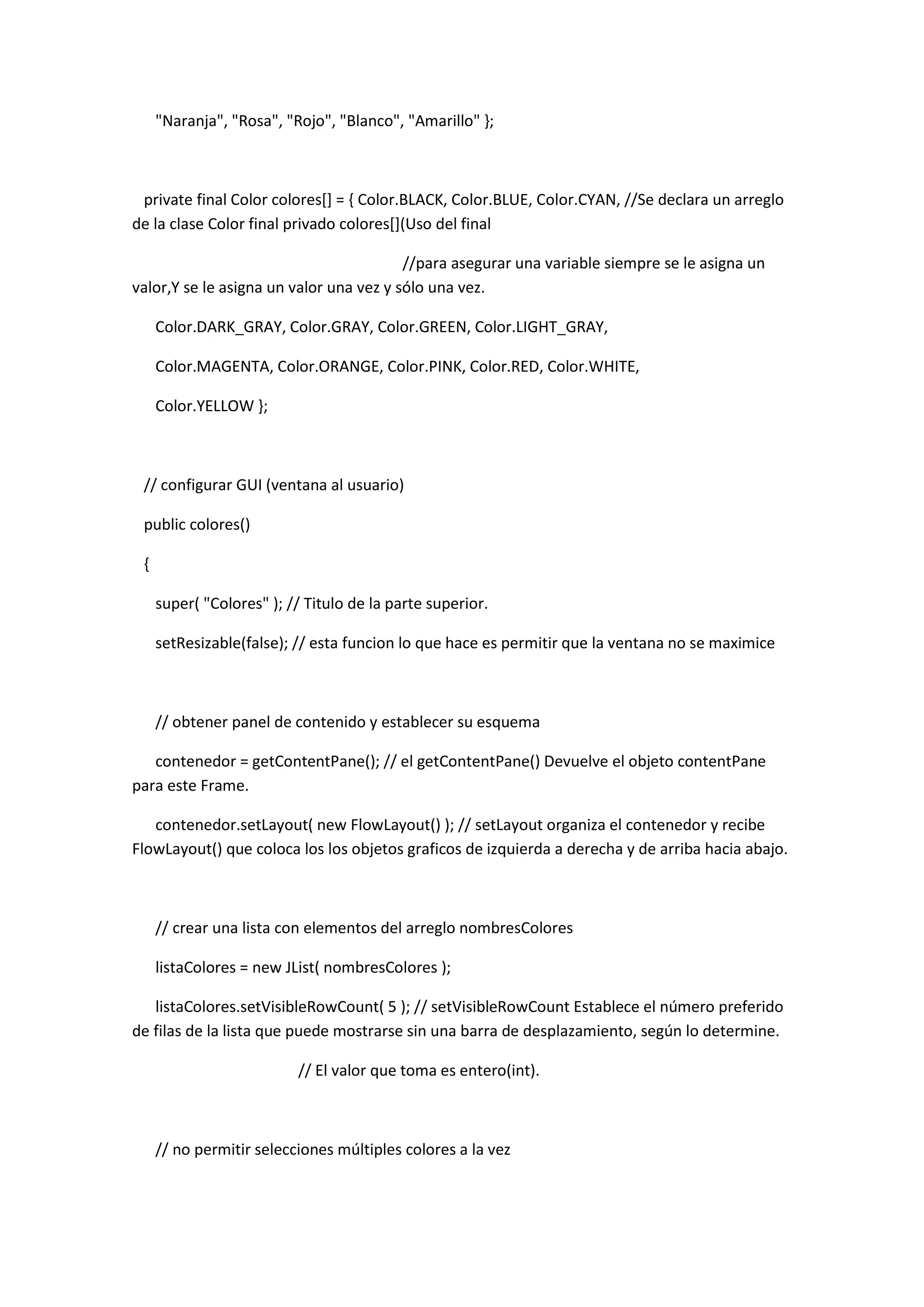Este documento presenta una clase Java llamada "colores" que crea una interfaz gráfica para seleccionar colores de una lista desplegable. La clase importa paquetes para componentes gráficos y eventos de Swing. Declara arreglos de nombres de colores y objetos de color. El constructor crea una lista desplegable de nombres de colores y establece un listener que cambia el color de fondo cuando se selecciona un color. La clase establece el tamaño de la ventana y la hace visible.