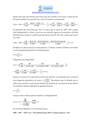 El documento analiza cuál de los términos 101 o la suma de 100+99 es mayor para diferentes valores de n. Determina que 101 es mayor cuando n es mayor o igual a 49, mientras que la suma es mayor cuando n es menor que 49. Esto se demuestra resolviendo las expresiones como progresiones geométricas y utilizando fórmulas matemáticas.