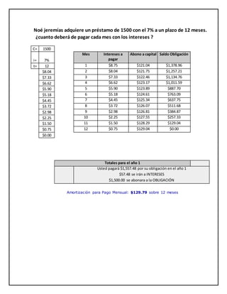 Noé jeremías adquiere un préstamo de 1500 con el 7% de interés a pagar en cuotas mensuales de 129.79 durante 12 meses. Cada mes, parte del pago se destina al pago de intereses y otra parte a reducir el capital pendiente, hasta cancelar la deuda completa al final del plazo.