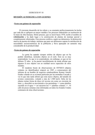 El documento describe brevemente la historia y el desarrollo de los robots industriales y los efectos de la robotización en el empleo humano, así como las perspectivas encontradas sobre este tema. También resume las primeras observaciones de objetos volantes no identificados (OVNI) en 1947 y cómo esto llevó a un aumento en las afirmaciones de avistamientos de naves espaciales extraterrestres en las décadas siguientes.