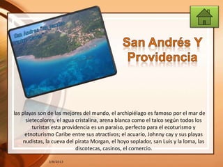 Este documento describe varias regiones y atracciones turísticas de Colombia. Habla de las Islas de Providencia y Santa Catalina en el Mar Caribe, conocidas por sus playas de arena blanca y aguas cristalinas. También menciona la región Caribe colombiana, caracterizada por su gente alegre y su música como la cumbia y el vallenato. Otras atracciones turísticas descritas incluyen el Rodadero en Santa Marta, el Carnaval de Barranquilla y varios destinos en el departamento de Córdoba.