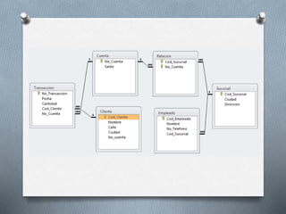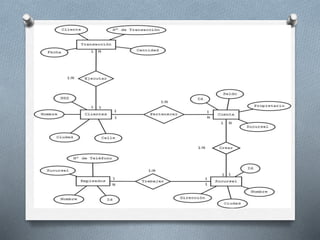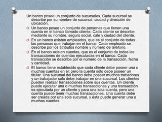 Este documento describe un banco con sucursales, clientes, empleados, cuentas y transacciones. Cada sucursal, cliente, empleado, cuenta y transacción tiene atributos específicos como nombre, dirección, número de teléfono, saldo, fecha, etc. El documento también establece las relaciones entre estas entidades, como que un cliente puede tener una o más cuentas, una cuenta solo puede tener un titular, un empleado solo puede trabajar en una sucursal, etc.