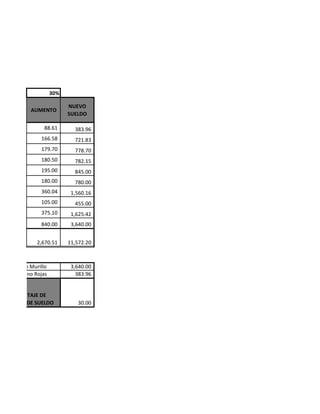 Este documento presenta el cálculo del aumento salarial del 30% para 10 empleados del Hotel Escuela La Casa Lojana. Se muestra el nombre, apellido, ciudad y sueldo actual de cada empleado, así como el aumento y nuevo sueldo calculado con el incremento del 30%. El empleado con el sueldo más alto es Narcisa de Jesús Zapatero Murillo con $2,800 y el más bajo es Gloria Altamirano Rojas con $295.35. Tras aplicar el aumento del 30%, el nuevo sueldo más alto es de $3