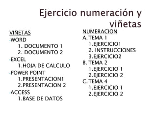 El documento presenta ejemplos de numeración, viñetas y autoformas utilizadas en Microsoft Word y PowerPoint. Incluye listas numeradas y con viñetas sobre temas, documentos, hojas de cálculo y presentaciones. También contiene un diagrama con el proceso de reciclaje del vidrio mostrando las etapas de recogida, planta de tratamiento, fabrica de envases y consumidor responsable.