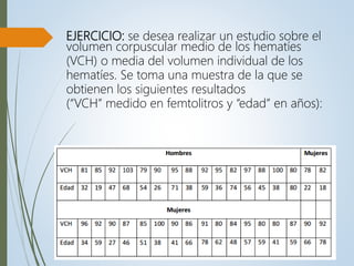 Este documento presenta los pasos para analizar datos sobre el volumen corpuscular medio de hematíes y la edad y sexo de pacientes usando el programa estadístico SPSS. Instruye definir las variables, introducir los datos, y calcular medidas estadísticas descriptivas y crear gráficos para analizar la distribución de las variables y relacionarlas.