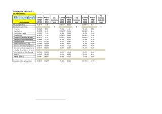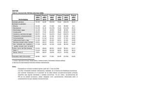 El documento presenta datos sobre el cálculo del Producto Interno Bruto (PIB) real y nominal de un país para los años 2010, 2009 y 2008. Contiene tablas con las cantidades producidas, precios y valores del PIB nominal de distintas actividades económicas para cada año, así como cálculos para obtener el PIB real usando índices de precios. El objetivo es medir y comparar el tamaño de la economía entre años usando valores constantes.