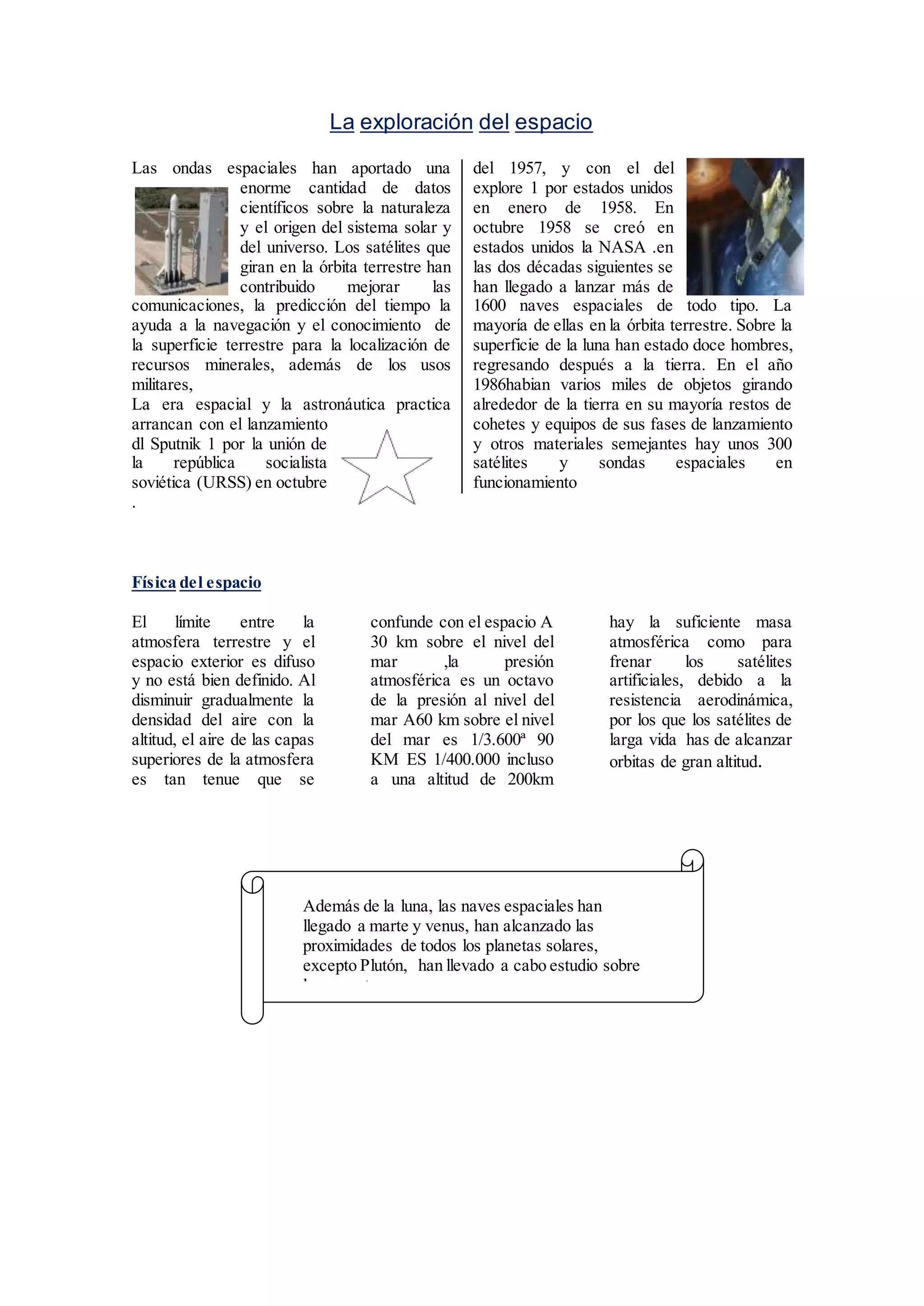 La exploración del espacio comenzó con el lanzamiento del Sputnik 1 por la Unión Soviética en 1957 y del Explorer 1 por Estados Unidos en 1958. Desde entonces, se han lanzado más de 1600 naves espaciales, la mayoría a la órbita terrestre. Los satélites han mejorado las comunicaciones, la predicción del tiempo, la navegación y el conocimiento de la Tierra. Doce hombres han caminado sobre la Luna. Además de la Luna, las naves espaciales han visitado Marte, Venus y los planetas exteriores,
