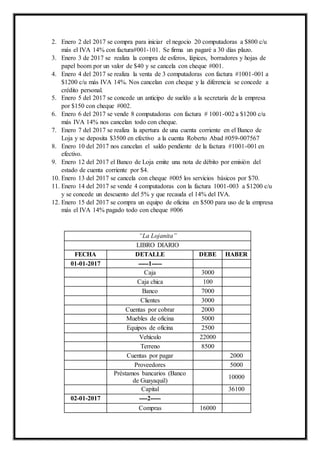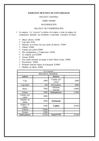 Este documento presenta un ejemplo práctico de contabilidad para la empresa "La Lojanita" que incluye el balance general inicial, las transacciones del primero al quince de enero, el libro diario y la mayorización de cuentas. Resume las operaciones iniciales de la empresa y las compras, ventas, pagos y cobros realizados durante el periodo.