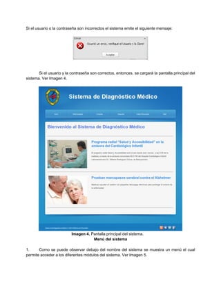 El documento describe un sistema de diagnóstico médico que permite a los usuarios iniciar sesión e ingresar al sistema a través de un navegador web. Una vez dentro, los usuarios pueden acceder a módulos para ver enfermedades, registrar y diagnosticar pacientes, generar reportes, ver y editar su perfil, y cerrar sesión.